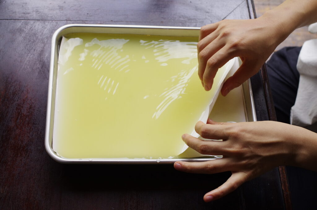 染液は淡い青柿色ですが、紙を繰り返し日光にあてることで濃い茶色へと変わっていきます。