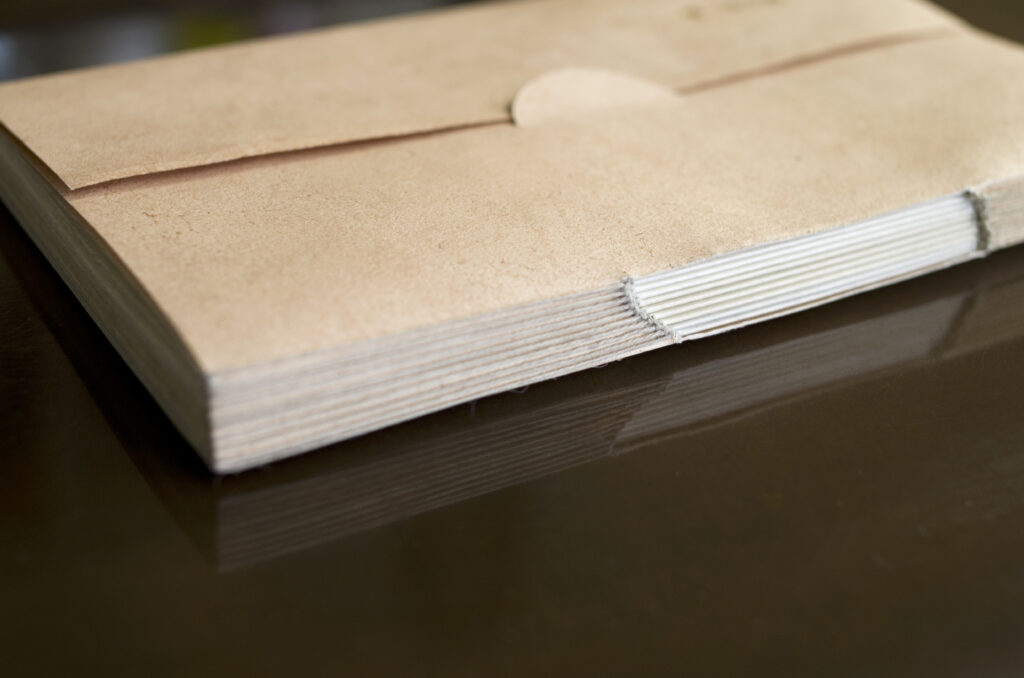 染色:表紙/柿渋染め 綴じ糸/栗(グレー)、クヌギ(ベージュ)