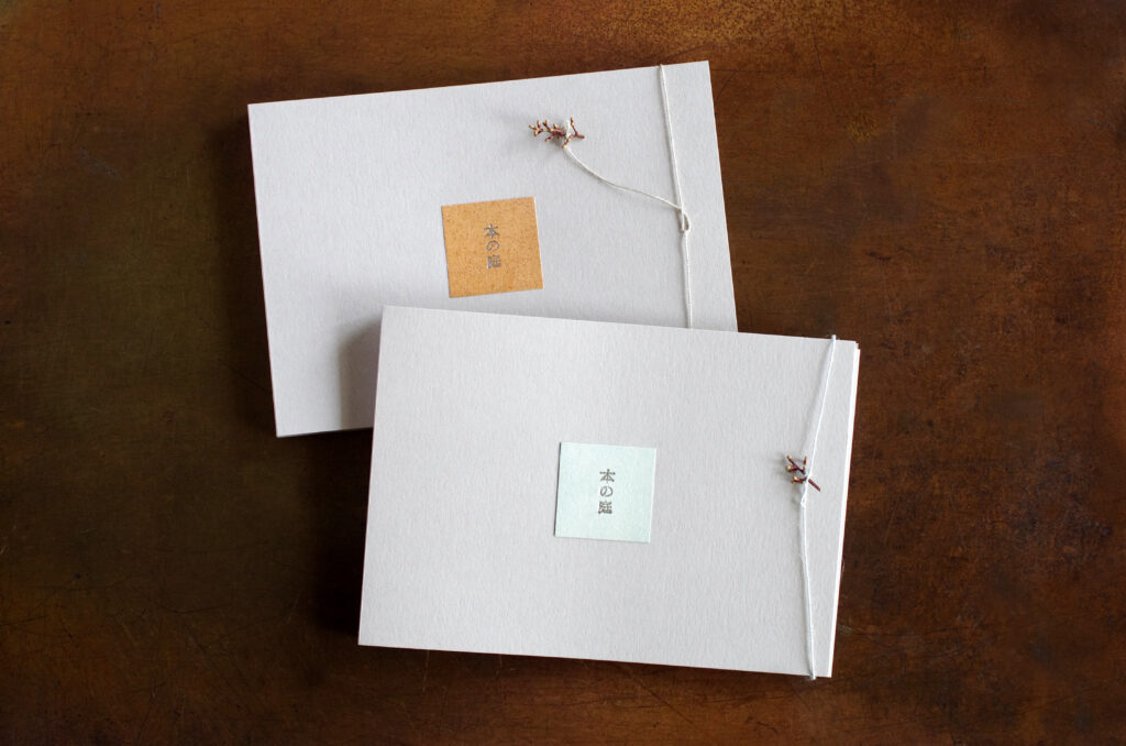 表面には、草木染めの「色」を、裏面には、手製本で本の「かたち」ができるまでを収めています。
