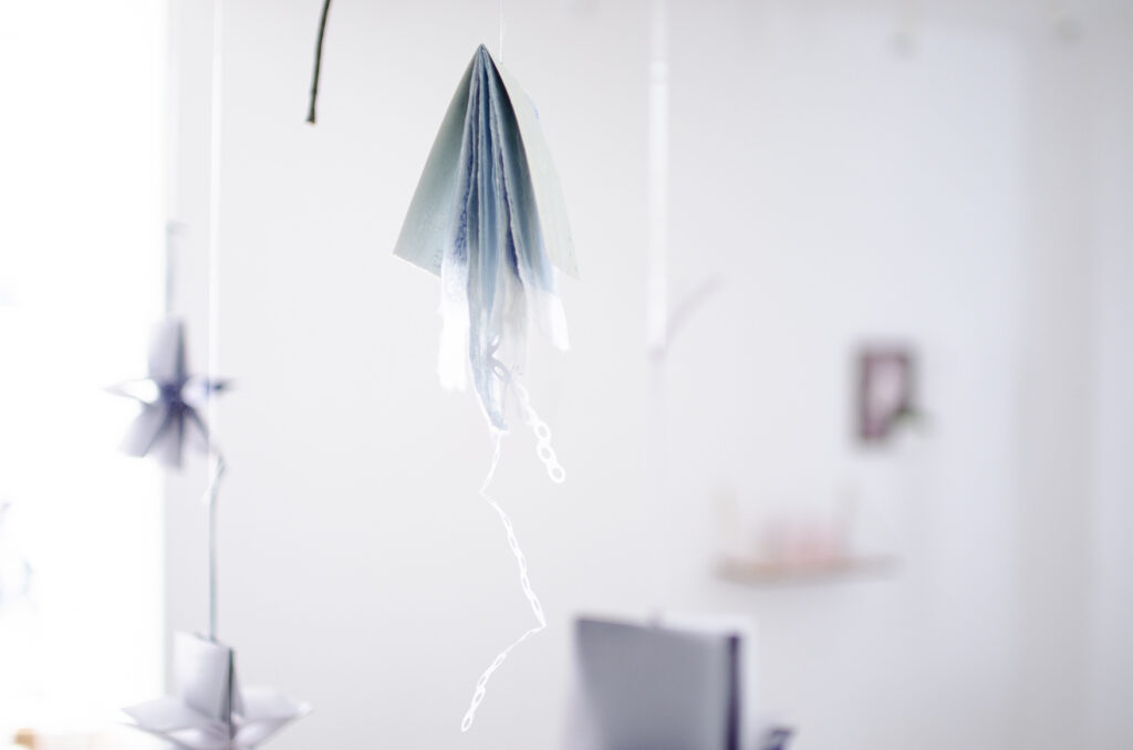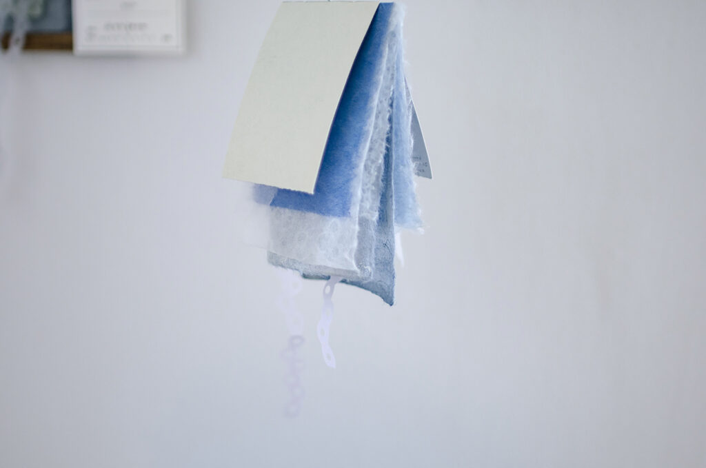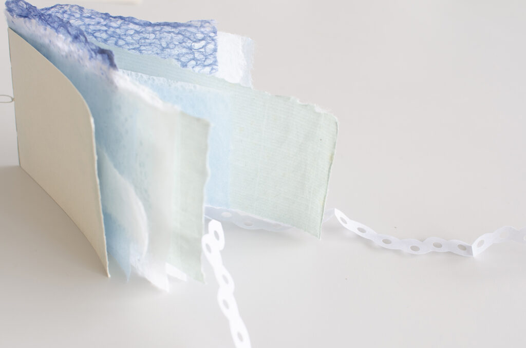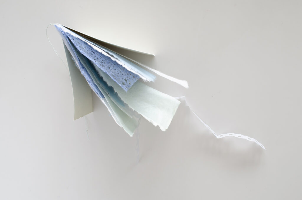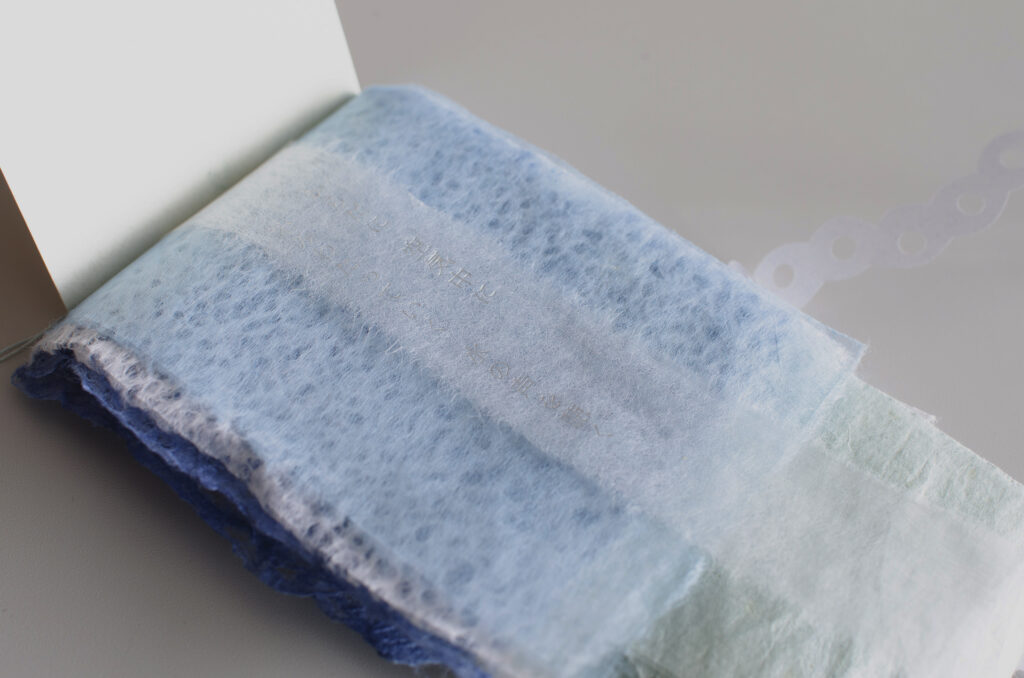 水の流れに手を浸して作られた和紙を、さまざまに綴じ合わせた。