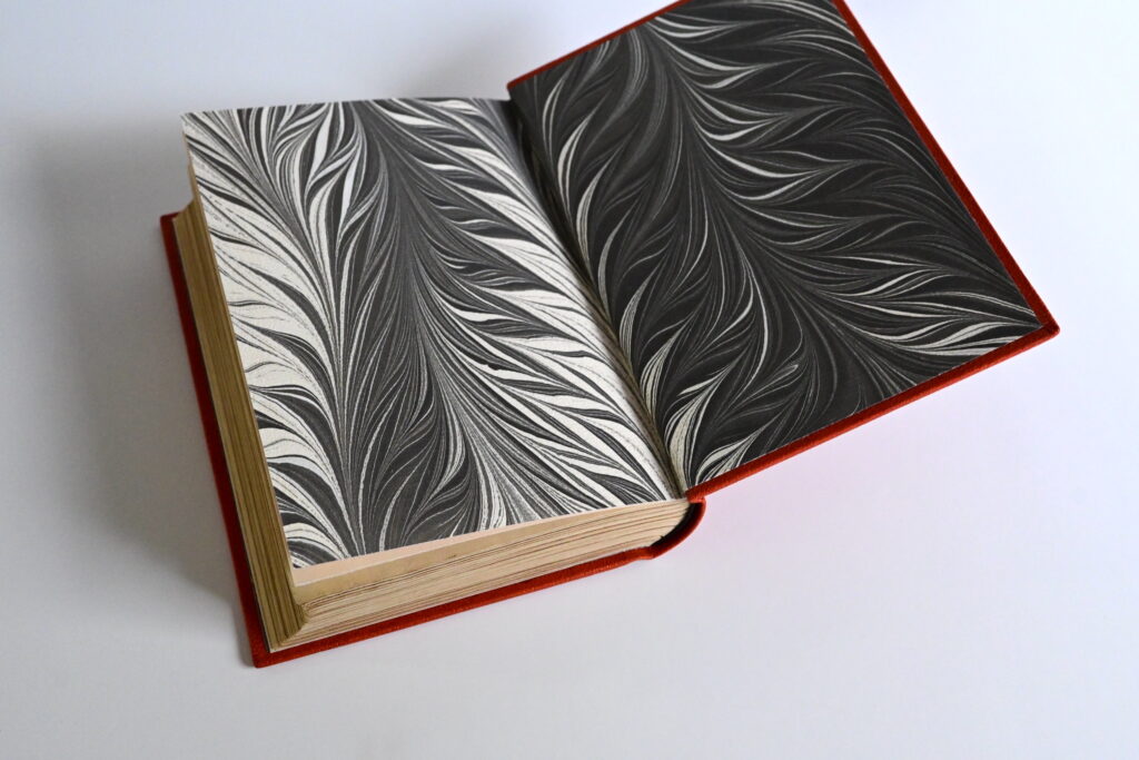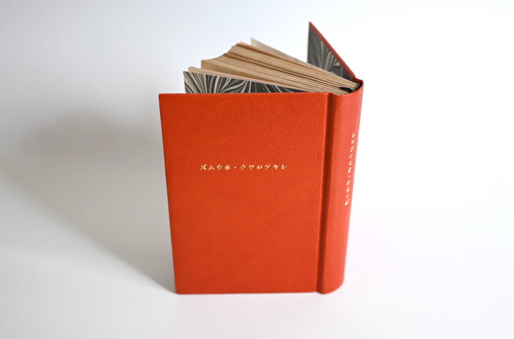 100×150mm、618p、糸綴じ、総革装丸背上製本、背と平に金箔押しタイトル、小口三方やすりがけ