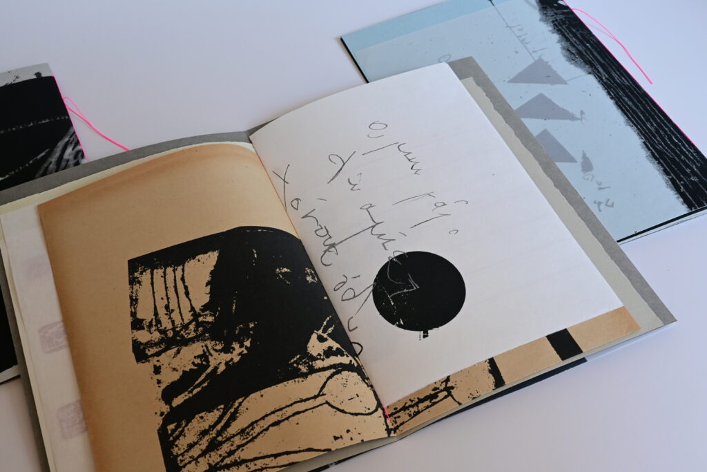 シルクスクリーンプリントや蜜蝋画、さまざまな紙を綴じ込んでいます。
